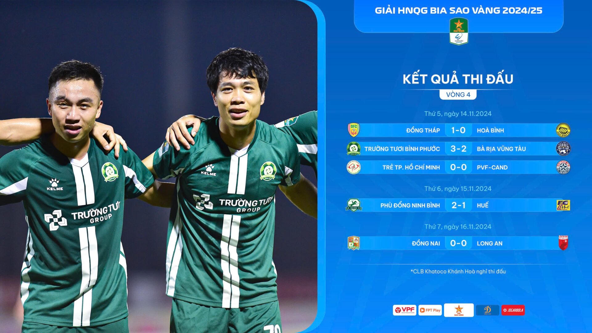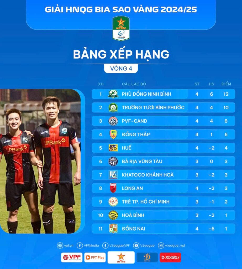 Thầy trò HLV Việt Thắng tiếp tục kéo dài chuỗi trận thắng lên con số 4 với trận thắng 2-1 trước CLB Huế ở vòng 4. Chiến thắng không hề dễ dàng bởi phải đến phút 90 của trận đấu, Hoàng Đức mới có thể ấn định tỉ số 1-2. Với 12 điểm có được, CLB Phù Đổng Ninh Bình đang dần tạo ra khoảng cách khá an toàn với các ứng viên khác như Trường Tươi Bình Phước (10 điểm) và PVF-CAND (8 điểm).