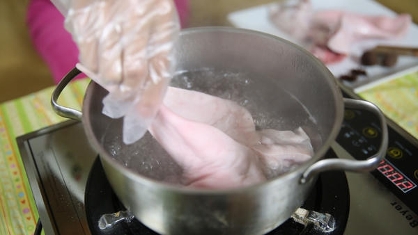 Pha nồi nước lạnh với chút giấm, rồi thả tai vào luộc chín, vớt ra bát.