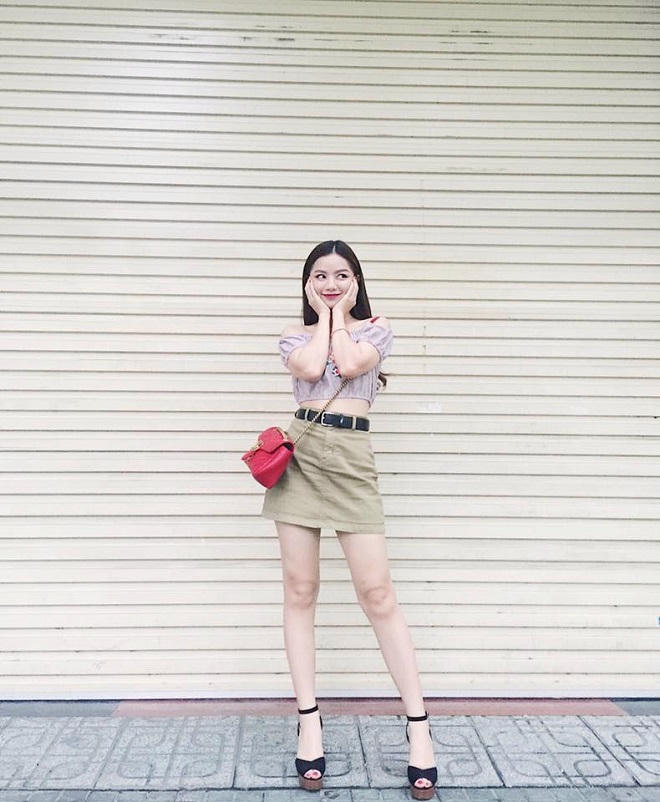 Chân váy ngắn: Đây là một trong những items thời trang được phái nữ săn lùng nhiều nhất trong mùa hè. Thiết kế mang lại sự thoải mái cũng như thể hiện nét cá tính khi phối cùng giày boots, áo hai dây như Quỳnh Anh Shyn.