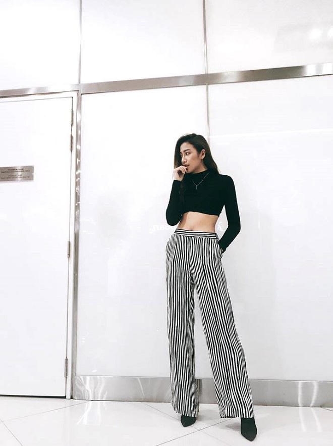 Phan Ngân gợi cảm khi kết hợp crop-top với quần tây ống suông. Những đường kẻ sọc trên trang phục giúp tôn lên chiều dài đôi chân của người đẹp.