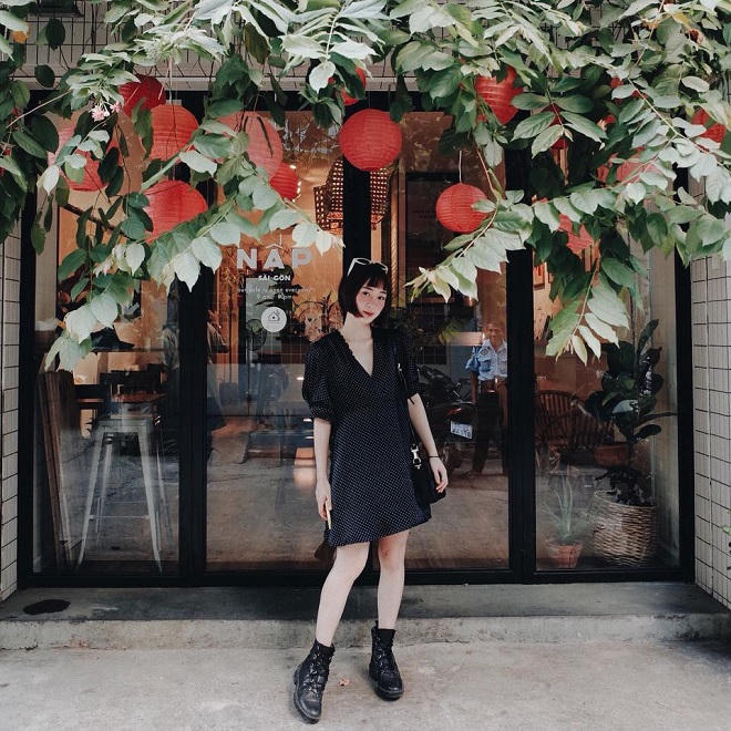 Váy họa tiết: Trong những ngày thời tiết oi bức, các cô gái có thể lựa chọn những mẫu váy họa tiết trẻ trung. Phom dáng suông cùng đường chiết eo đơn giản sẽ mang đến sự thoải mái khi xuống phố ngày cuối tuần. Hot girl Sun HT thể hiện cá tính bằng cách lựa chọn giày combat boots hầm hố.