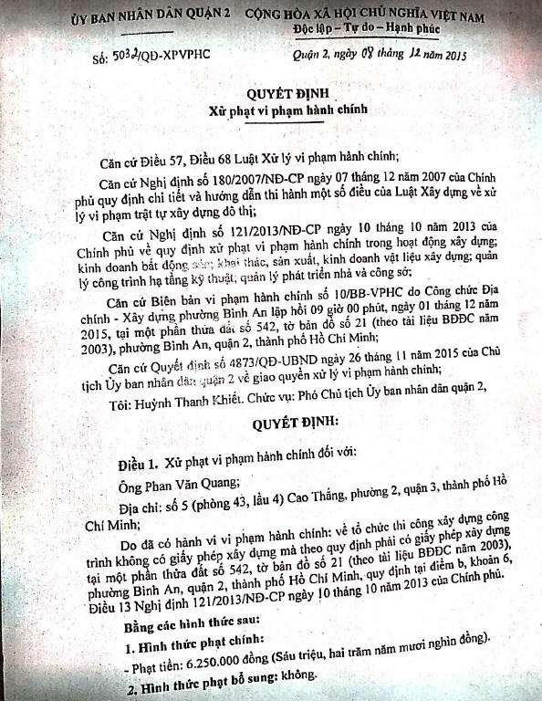 Trước đó, ngày 8/12/2015, Phó Chủ tịch UBND quận 2 Huỳnh Thanh Khiết đã ra Quyết định số 5031/QĐ-XPVPHC và Quyết định số 5032/QĐ-XPVPHC về xử phạt vi phạm hành chính với ông Phan Văn Quang do đã có hành vi vi phạm hành chính về tổ chức thi công xây dựng công trình không có giấy phép xây dựng mà theo quy định phải có giấy phép xây dựng tại một phần thửa đất số 541 và 542, tờ bản đồ số 21 (theo tài liệu BĐĐC năm 2003), phường Bình An, quy định tại điểm b khoản 6 Điều 13 Nghị định 121/2013/NĐ-CP ngày 10/10/2013 của Chính phủ. Tổng số tiền xử phạt là 12,5 triệu đồng.
