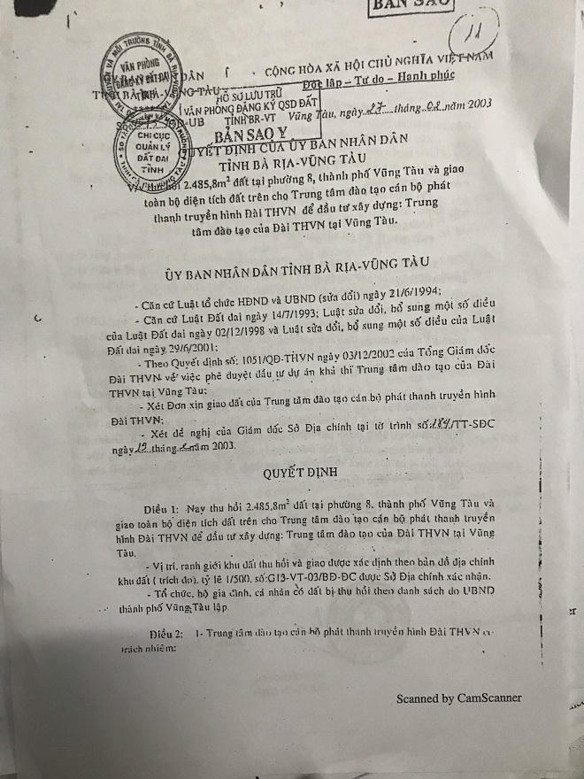 Ngày 22/9/2004, UBND tỉnh ban hành Quyết định số 6836/QĐ-UB phê duyệt kinh phí bồi thường hỗ trợ do thu hồi 1.027 m2 đất trong sổ đỏ nêu trên để giao Trung tâm đào tạo, bồi dưỡng cán bộ phát thanh truyền hình.