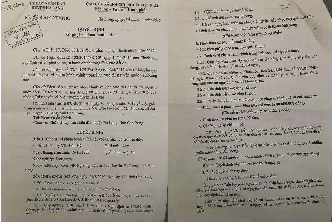 Hơn 2 năm sau, tới tháng 6/2019, UBND huyện Hạ Lang mới ban hành Quyết định số 965/QĐ-XPVPHC về việc xử phạt vi phạm hành chính trong lĩnh vực đất đai và lĩnh vực tài nguyên nước và khoáng sản.