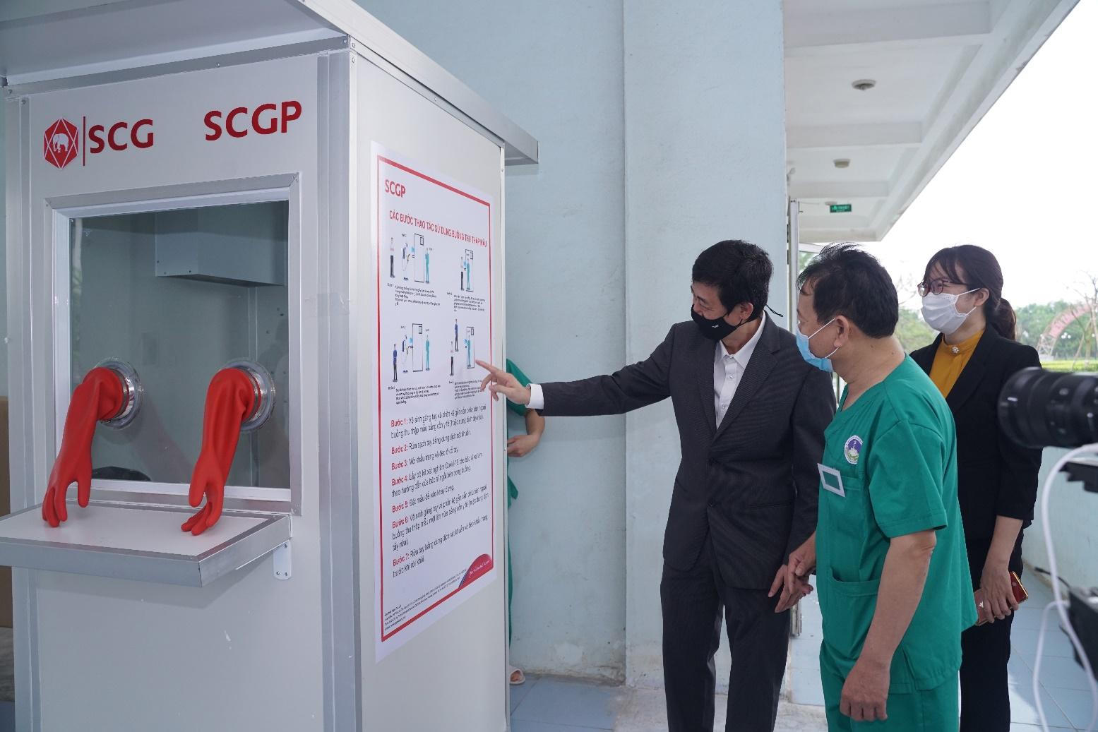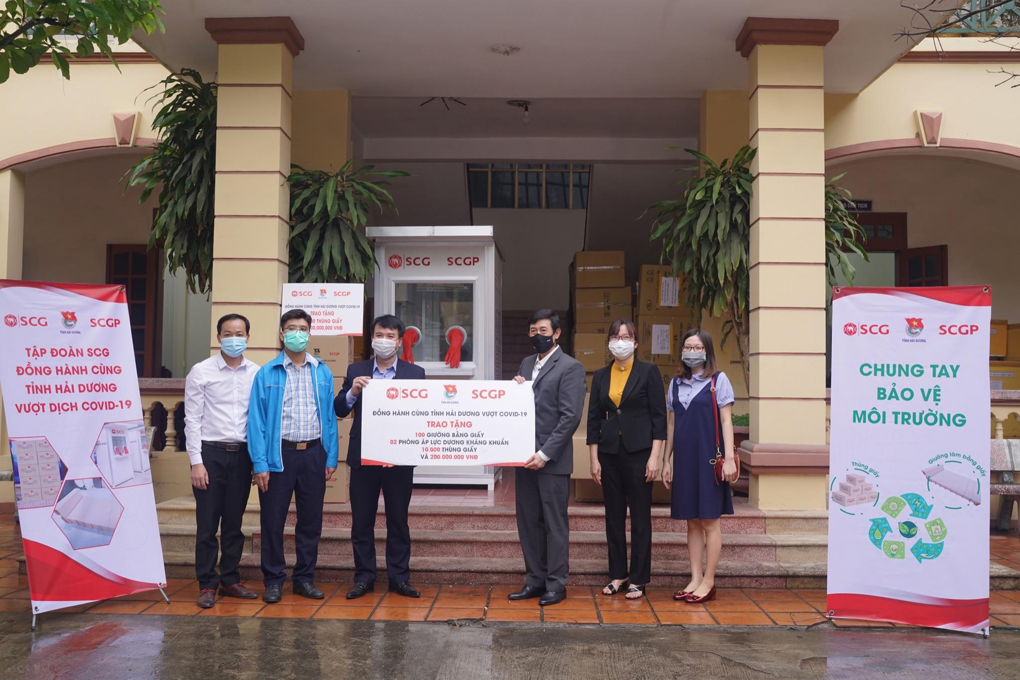 Song song đó, SCGP cũng trao tặng 06 buồng áp lực dương để hỗ trợ đội ngũ y bác sĩ Hải Dương và Bình Dương thu thập mẫu bệnh phẩm an toàn, cùng hiện kim trị giá 200 triệu đồng ủng hộ cho các hoạt động chống dịch Covid-19.