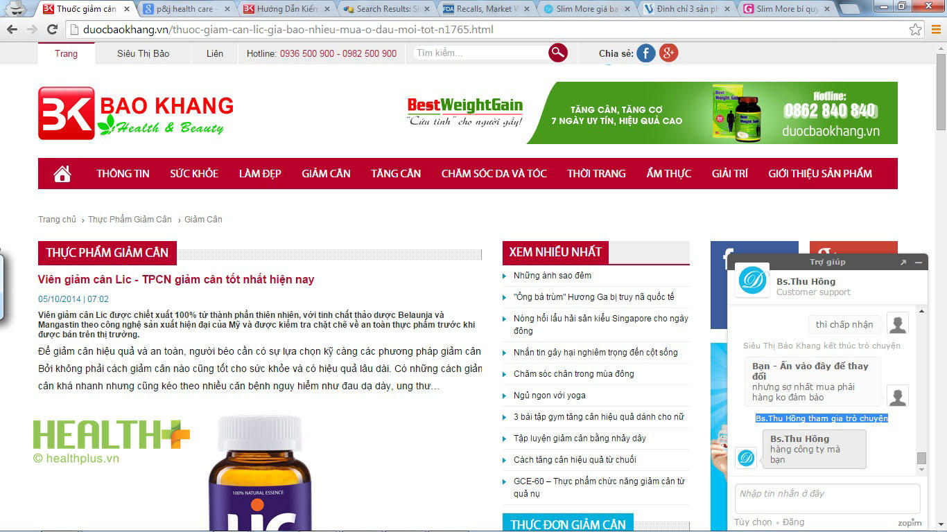 Hình ảnh của nhân viên tư vấn trong đồng phục của Công ty TNHH đầu tư thương mại xuất nhập khẩu Bảo Khang cũng được giữ lại trên website. Khi phóng viên hỏi mua “thuốc giảm cân Lic” thì nhân viên tư vấn của “Siêu thị Bảo Khang” đề nghị phóng viên cung cấp địa chỉ và số điện thoại để công ty giao hàng tận nơi.