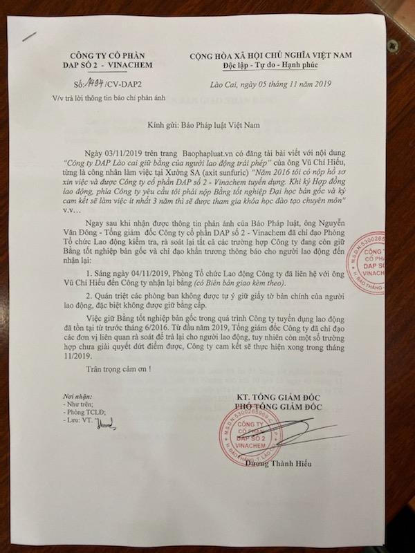 Trước đó Báo PLVN đã nhận được đơn thư của anh Vũ Chí Hiếu, từng làm việc tại xưởng SA (axit sunfuric) của Công ty Cổ phần DAP số 2 Lào Cai – Vinachem, trình bày: “Năm 2016 anh Hiếu có nộp hồ sơ xin việc và được Công ty Cổ phần DAP số 2 Lào Cai – Vinachem tuyển dụng. Khi ký Hợp đồng lao động, phía công ty yêu cầu anh Hiếu phải nộp Bằng tốt nghiệp bản gốc và ký cam kết sẽ làm việc ít nhất 3 năm thì sẽ được tham gia khóa học đào tạo chuyên môn".