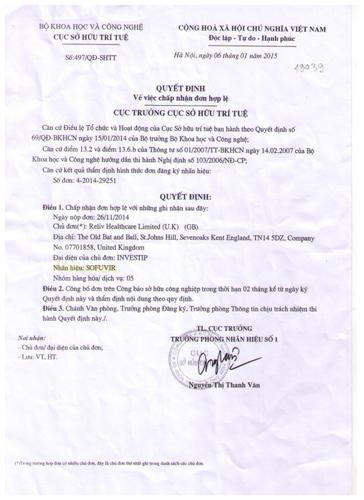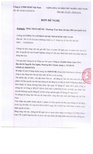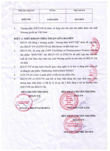 Tên thuốc này sở hữu của Tập đoàn MyLan, đã đăng ký bảo hộ trên toàn thế giới vi phạm với bản quyền của tên mà Công ty DTH đã đăng ký sở hữu là SOFUVIR, theo biên bản thoả thuận sử dụng thương hiệu được lập ngày 5/7/2015 giữa công ty DTH và Công ty RELIV HEALTHCARE LIMITED (U.K) và Giấy xác nhận việc chuyển nhượng quyền đăng ký sở hữu công nghiệp ngày 5/7/2015.