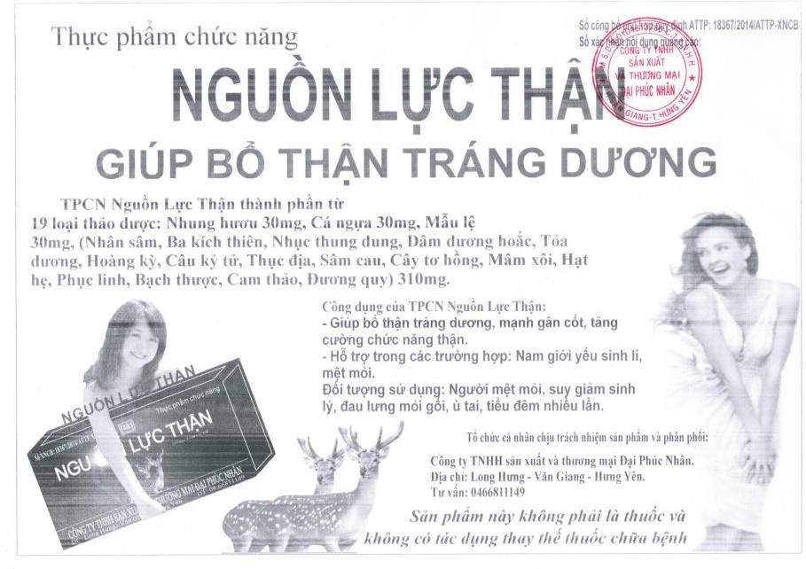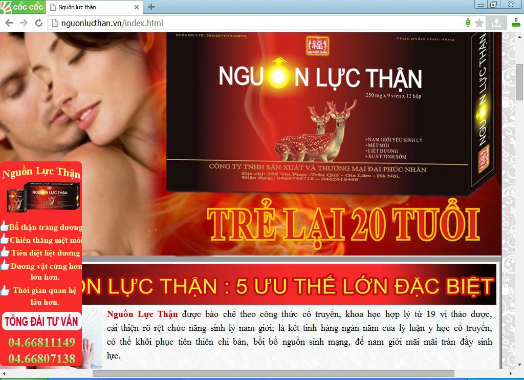 Tuy nhiên, trên website http://nguonlucthan.vn, Công ty Đại Phúc Nhân một lần nữa lại không tuân thủ xác nhận của Cục ATTP, quảng cáo thành: “Giúp bổ thận tráng dương, mạnh gân cốt, tăng cường chức năng thận. Hỗ trợ điều trị các trường hợp nam giới yếu sinh lý, mệt mỏi, liệt dương, xuất tinh sớm,...”. Thậm chí, còn nhấn mạnh: “Nguồn Lực Thận: Bổ thận tráng dương; Chiến thắng mệt mỏi; Tiêu diệt liệt dương; Dương vật cứng hơn, lớn hơn; Thời gian quan hệ lâu hơn”. Ngoài ra, trong mục Khuyến mãi lớn: Mua 1 hộp to tặng 2 hộp nhỏ, doanh nghiệp này còn chèn quảng cáo sản phẩm có khả năng: tiêu diệt 4 triệu chứng thận hư, trẻ lại 20 tuổi. Nguồn lực thận – 4 công hiệu lớn: Tiêu diệt liệt dương, xử bắn xuất tinh sớm, chiến thắng mệt mỏi, xử trảm yếu sinh lý.