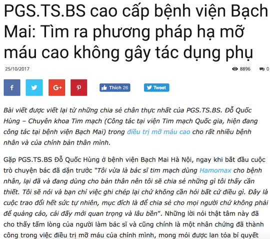 Cụ thể, trên website hamomax.vn đăng bài với tiêu đề “PGS.TS.BS cao cấp Bệnh viện Bạch Mai: Tìm ra phương pháp hạ mỡ máu cao không gây tác dụng phụ”.