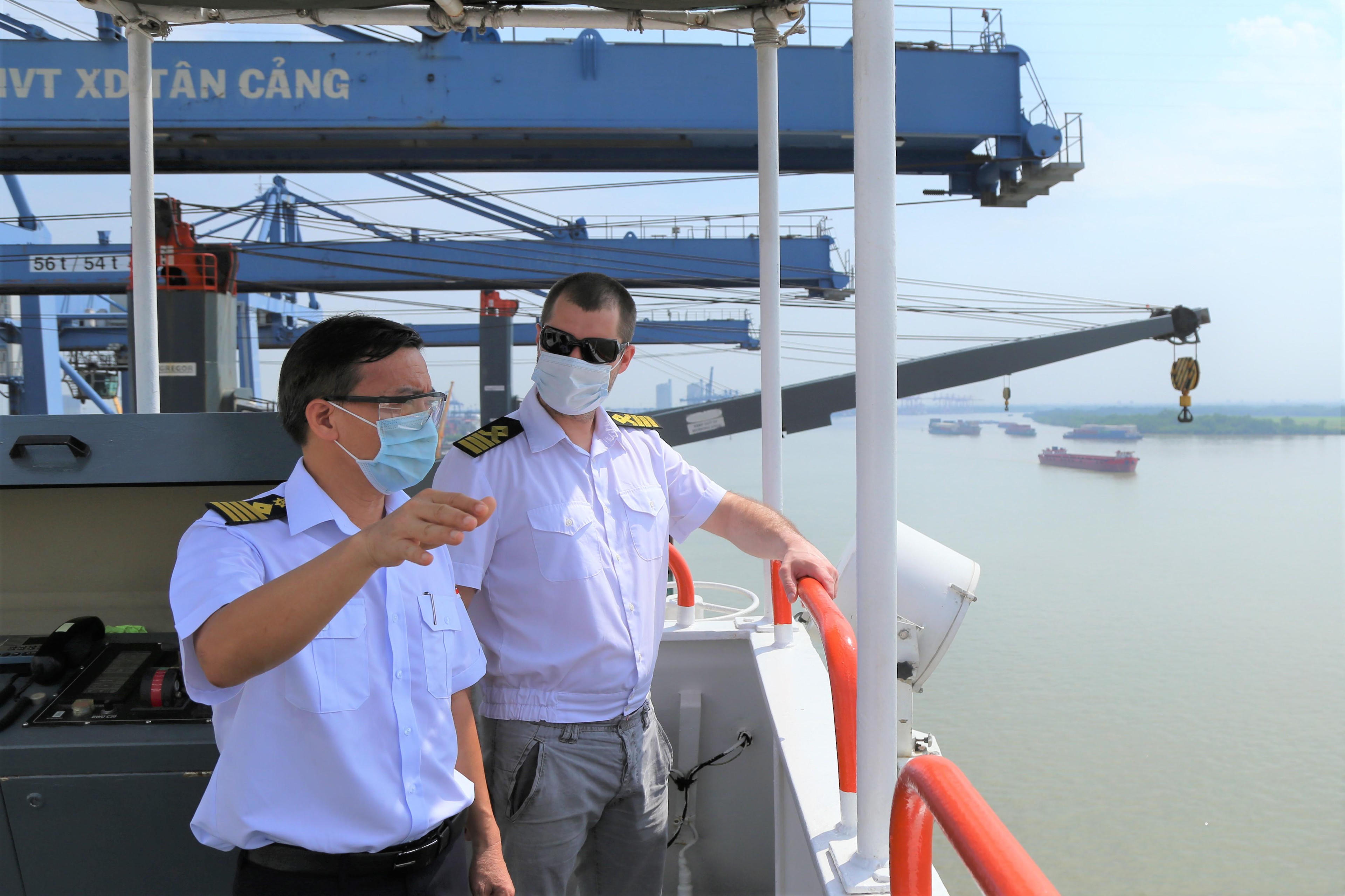 Hoa tiêu ngoại hạng Tạ Ngọc Hoàng trao đổi với đối tác về kinh nghiệm dẫn tàu trong luồng thủy hẹp |