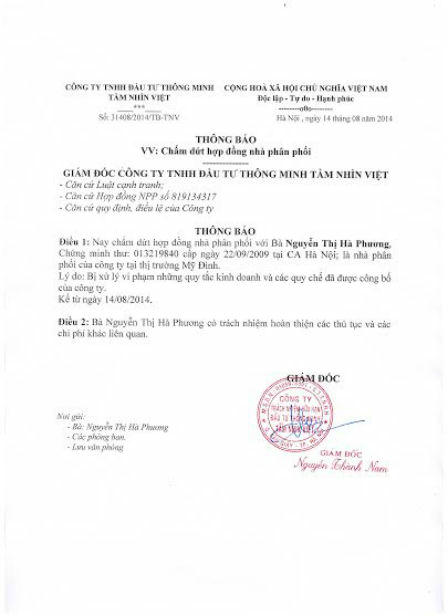 Qua trao đổi phóng viên được biết Công ty TNHH Đầu tư TM Tầm nhìn Việt là 1 công ty bán hàng theo hình thức KD đa cấp, có trụ sở chính tại KĐT Trung Hòa Nhân Chính, Quận Cầu Giấy. Cty đã thực hiện đầy đủ các thủ tục đăng ký bán hàng đa cấp theo luật định.