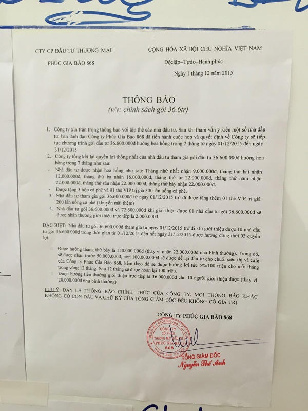 Theo đó, để được tham gia làm “cổ đông” của Công ty Phúc Gia Bảo, khách hàng phải nộp một khoản tiền theo các gói đầu tư mà công ty này đưa ra, tối thiểu từ 12 triệu đồng đến 72 triệu đồng, để “đầu tư” vào Công ty Phúc Gia Bảo