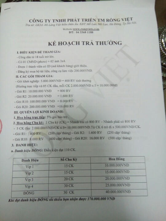 Cụ thể, sau nhiều ngày trong vai nhà phân phối tham gia hoạt động tại công ty Rồng Việt ở địa chỉ: LK 5A, 66 Làng Việt Kiều Châu Âu, KĐT Mỗ Lao, Hà Đông, Hà Nội. PV ghi nhận được 1 số tài liệu liên quan đến hoạt động kinh doanh đa cấp tại đây diễn ra khá rầm rộ, những nhà phân phối có thành tích tốt tại công ty Rồng Việt sẽ được hưởng hoa hồng lên tới cả tỷ đồng…
