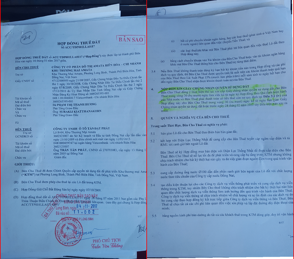 Cty Amata Biên Hòa nộp thuế một lần cho tổng diện tích 8.420m2 (phần đất mà công ty này đã cho Cty Tấn Đạt Phát thuê) cho Nhà nước và ngày 16/1/2017 đã tiến hành ký lại Hợp đồng thuê đất với Cty Tấn Đạt Phát. Trong đó, Điều 4 của hợp đồng này có nêu rõ: “Bên cho thuê đồng ý thực hiện thủ tục xin cấp GCNQSDĐ cho bên thuê trong vòng 30 ngày kể từ ngày ký Hợp đồng…”.