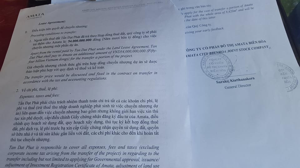 Đồng thời, tại cuộc họp do Ban Hành động hỗ trợ doanh nghiệp của tỉnh Đồng Nai chủ trì với sự tham dự của Văn phòng UBND tỉnh, Sở Kế hoạch & Đầu tư, TN&MT, Xây dựng, Cục thuế cùng đại diện Cty Amata Biên Hòa và Cty Tấn Đạt Phát, các bên cũng đã thống nhất theo 2 phương án: Một là Cty Amata Biên Hòa chuyển nhượng QSDĐ cho Cty Tấn Đạt Phát hoặc thay đổi nội dung trong giấy phép đầu tư; hai là đề xuất cho Cty Tấn Đạt Phát được cấp GCNQSDĐ như các doanh nghiệp đóng tiền thuê đất một lần cho 50 năm.