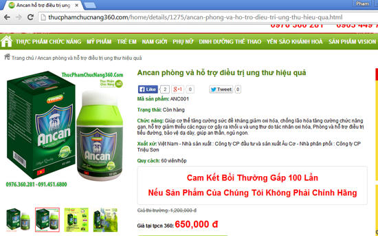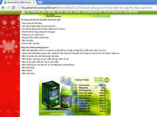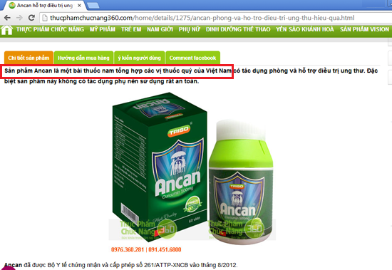 Đặc biệt, ngay phần đầu giới thiệu trên website http://thucphamchucnang360.com/ sản phẩm này lại được mô tả: "Sản phẩm Ancan là một bài thuốc nam tổng hợp các vị thuốc quý của Việt Nam có tác dụng phòng và hỗ trợ điều trị ung thư. Đặc biệt sản phẩm này không có tác dụng phụ nên sử dụng rất an toàn" nên khi đọc những thông tin quảng cáo phía dưới, hẳn nhiều người sẽ nghĩ đây là một loại "thần dược" có khả năng phòng ngừa và điều trị "bách bệnh".