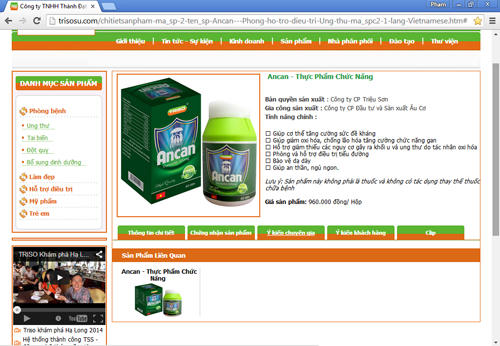 Tương tự, tại website www.trisosu.com của Công ty TNHH Thành Đạt Triệu Sơn (TRISO SUCCESS) - theo như giới thiệu là đơn vị chuyên phân phối các dòng sản phẩm từ dược liệu của Công ty TRISO thì hình ảnh, ý kiến đánh giá, nhận xét của một số “chuyên gia” được “đính kèm” trong phần giới thiệu sản phẩm TPCN Ancan trước đây được đăng trong các mục nhỏ như “Thông tin chi tiết"; "Chứng nhận sản phẩm"; "Ý kiến chuyên gia"; "Ý kiến khách hàng"; "Clip" để khi nhấp vào các thông tin này mới hiện ra thì nay phía TRISO cũng cho gỡ bỏ toàn bộ.