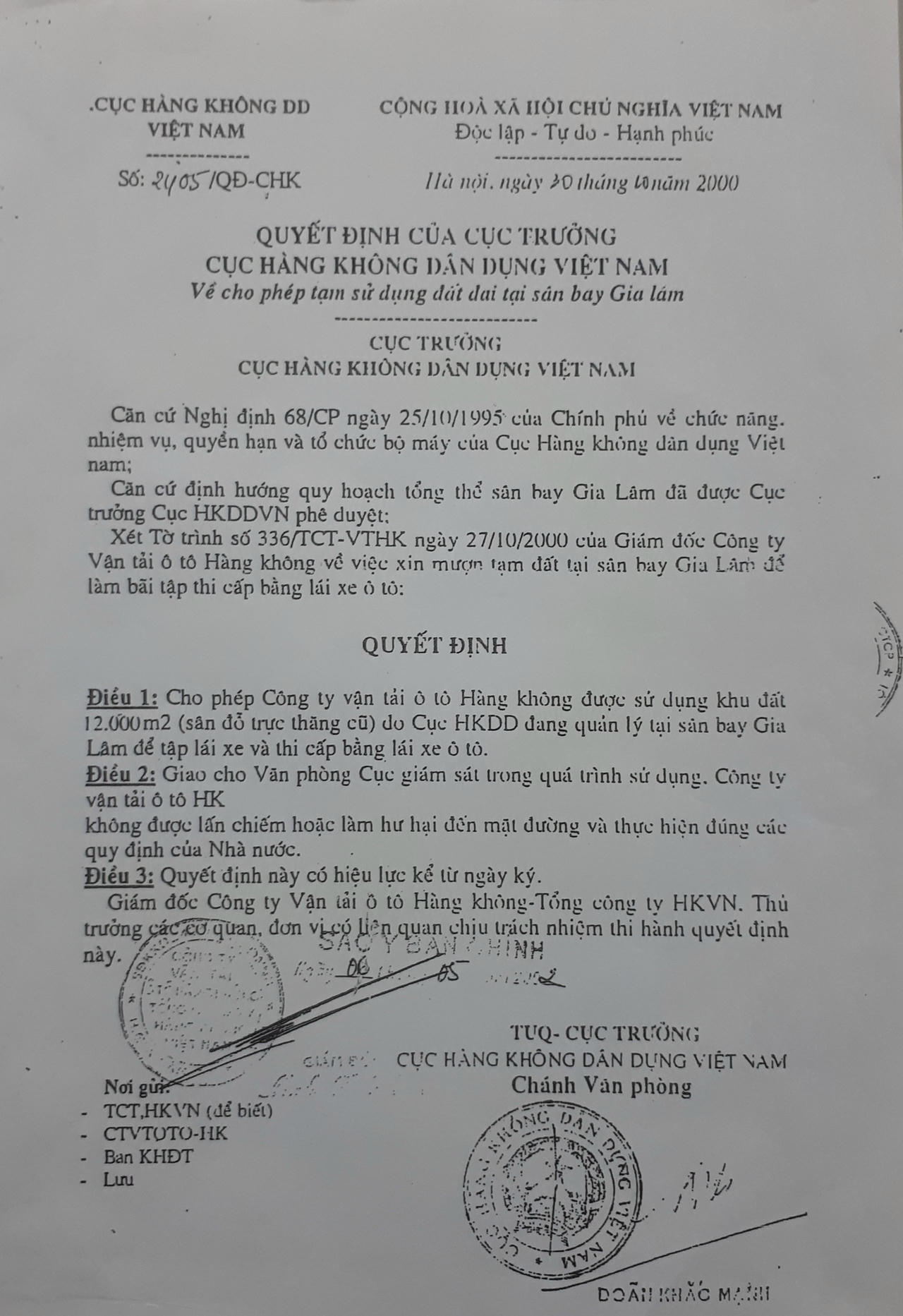 Theo tìm hiểu của PLVN, ngày 30/10/2000, Cục trưởng Cục Hàng không dân dụng Việt Nam đã có Quyết định số 2405/QĐ-CHK về việc cho phép Công ty Hàng không được sử dụng khu đất 12.000 m2 (sân đỗ trực thăng cũ) do Cục Hàng không dân dụng quản lý tại Sân bay Gia Lâm để doanh nghiệp này tập lái xe và thi cấp bằng lái xe ô tô.