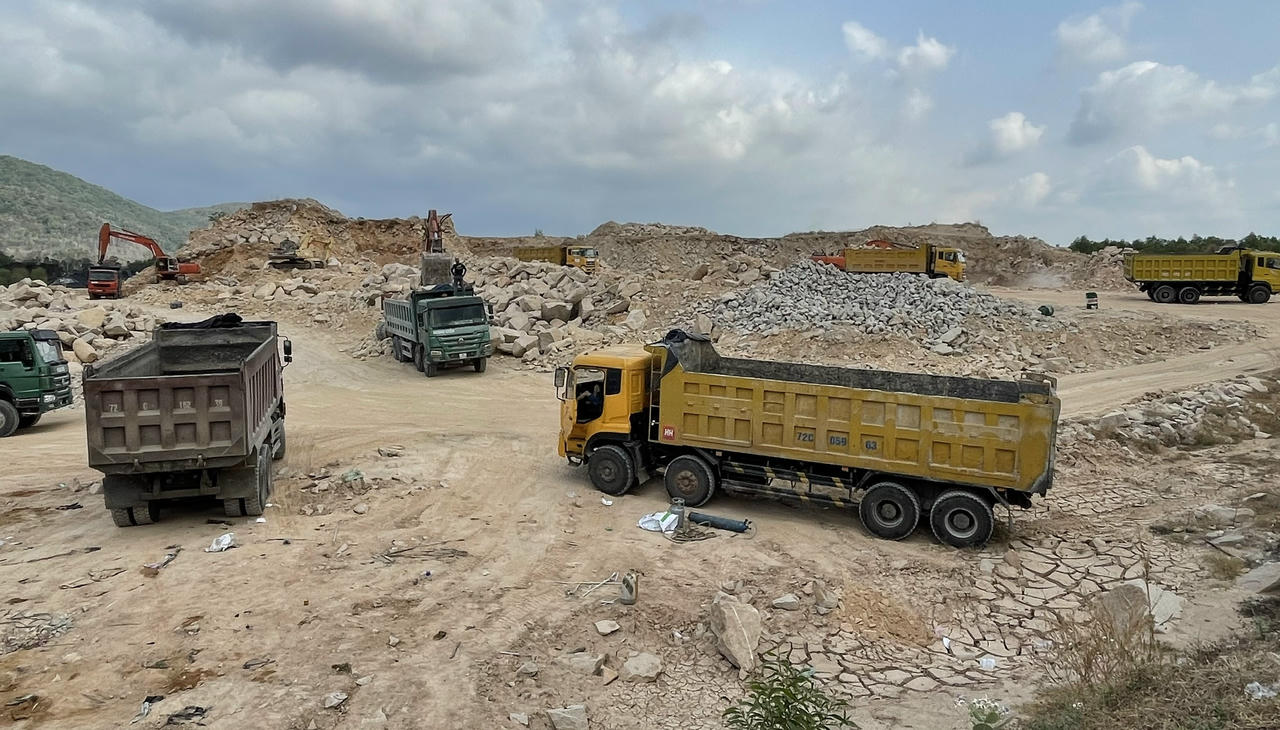 Bên trong khuôn viên rộng hàng chục héc ta, hàng chục máy cuốc đào đất, đá chất lên các xe ben chở đi nơi khác tiêu thụ. Những cái hố được tạo ra từ việc lấy đất, đá ngay lập tức được lấp đầy bằng chất thải rắn mà công ty này tiếp nhận.
