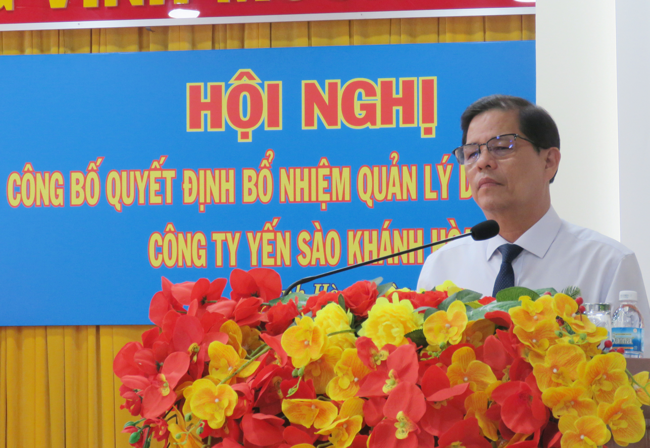 (PLVN) - Ngày 01/7/2024, Công ty TNHH Nhà nước MTV Yến sào Khánh Hòa (gọi tắt là Công ty Yến sào Khánh Hòa) đã tổ chức Hội nghị Công bố Quyết định bổ nhiệm quản lý doanh nghiệp với sự tham dự của ông Nguyễn Tấn Tuân - Phó Bí thư Tỉnh ủy, Chủ tịch UBND tỉnh Khánh Hòa; ông Võ Chí Vương - Giám đốc Sở Nội vụ; ông Nguyễn Thế Sinh - Bí thư Đảng ủy Khối doanh nghiệp tỉnh Khánh Hòa.