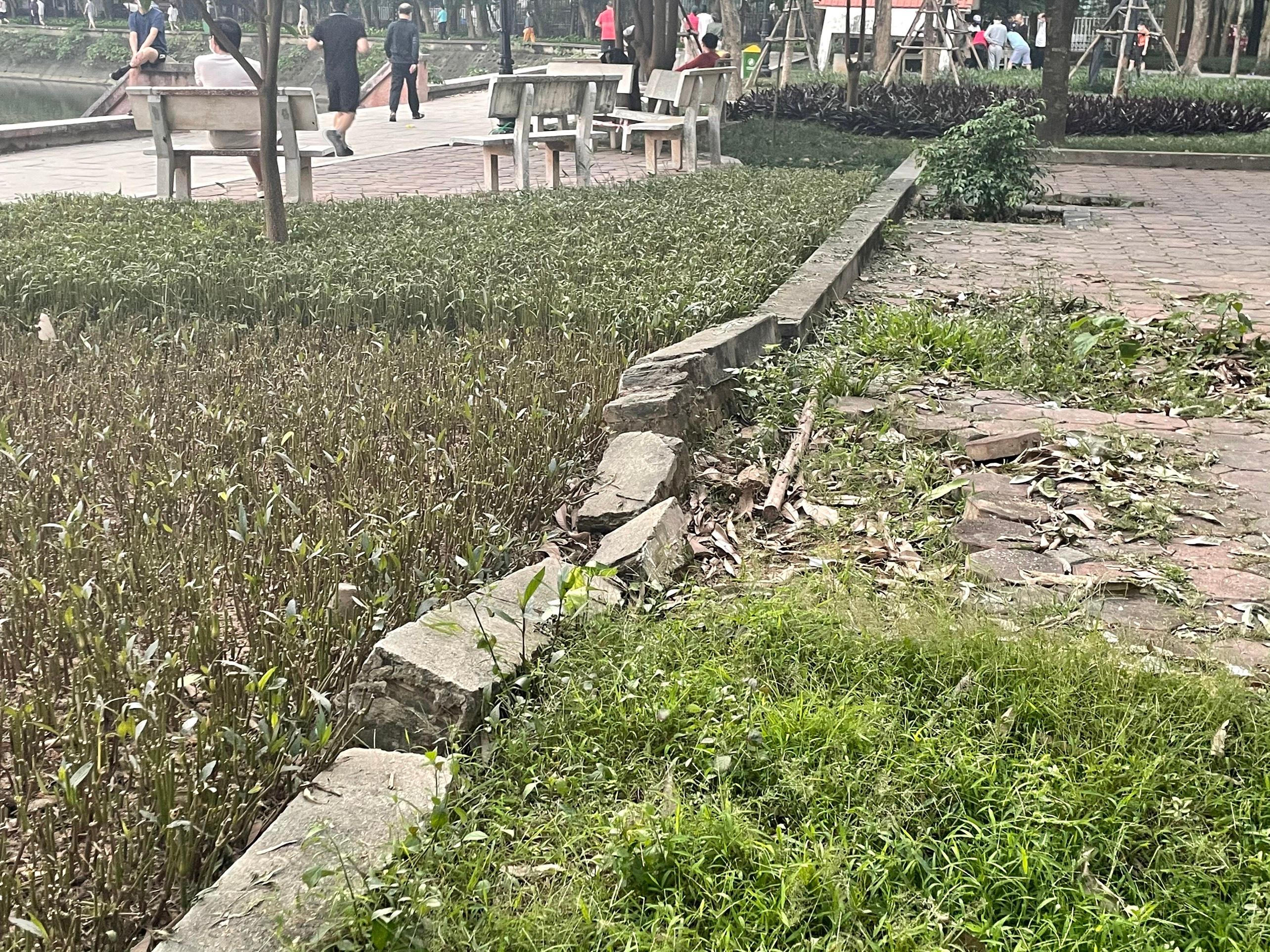 Vỉa tường vườn hoa gãy rời từng đoạn. |