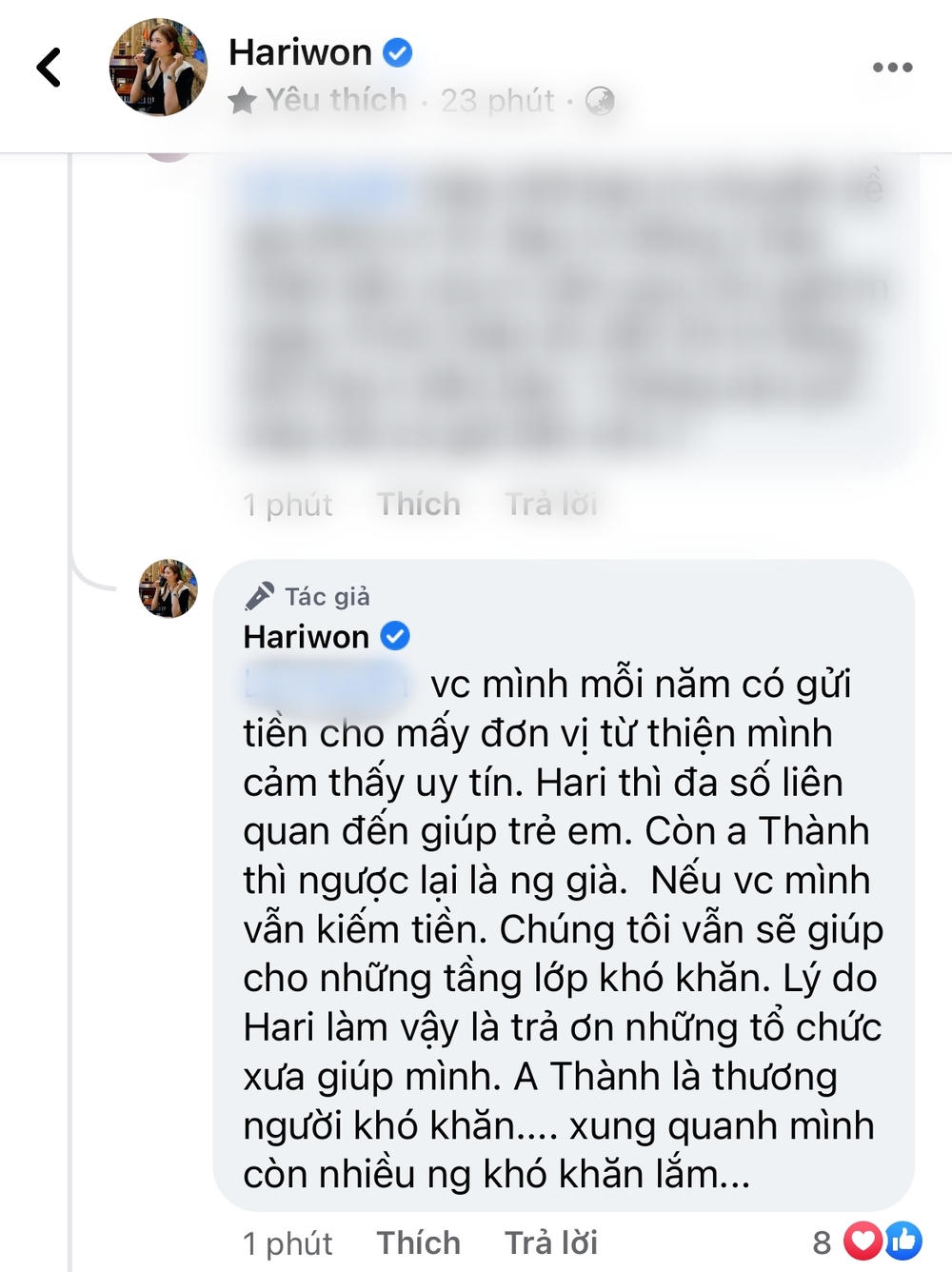 Nữ ca sĩ bộc bạch: "Vợ chồng mình mỗi năm có gửi tiền cho mấy đơn vị từ thiện mình cảm thấy uy tín. Hari thì đa số liên quan đến giúp trẻ em. Còn anh Thành thì ngược lại l à người già. Nếu vợ chồng mình vẫn kiếm tiền. Chúng tôi vẫn sẽ giúp cho những tầng lớp khó khăn. Lý do Hari làm vậy là trả ơn những tổ chức xưa giúp mình. Anh Thành là thương người khó khăn, xung quanh mình còn nhiều người khó khăn lắm".