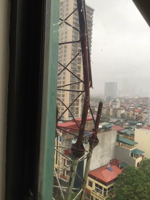 Cột thu phát sóng có độ cao ước tính khoảng vài ba chục mét đổ gãy trong cơn giông sáng nay, vị trí cột gãy hướng ra phía mặt đường Láng Hạ. Hiện hai đoạn cột gãy vẫn treo lơ lửng, được neo giữ lại nhờ những phần dây điện, dây cáp chằng chịt. Những người làm việc tại tòa nhà cho biết cột thu phát sóng đã tồn tại trên nóc nhà từ hơn 14 năm nay.