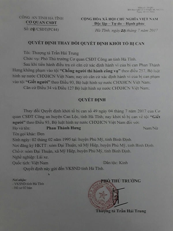 Căn cứ điều 34 và Điều 127 Bộ Luật hình sự, Cơ quan CSĐT Công an Hà Tĩnh quyết định thay đổi quyết định khởi tố bị can số 49 ngày 4/7/2017 của Cơ quan CSĐT Công an huyện Can Lộc, Hà Tĩnh, nay khởi tố bị can Phan Thành Hưng (SN 1995, trú tại xóm Đại Thuận, xã Mỹ Hiệp, huyện Phù Mỹ, Bình Định) về tội “Giết người”. Viện trưởng Viện kiểm sát nhân dân tỉnh Hà Tĩnh đã phê chuẩn quyết định thay đổi quyết định khởi tố bị can đối với Phan Thành Hưng từ tội “Chống người thi hành công vụ” sang tội “Giết người”.