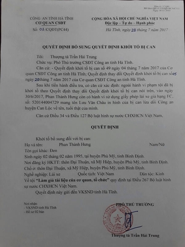 Ngoài ra, vào ngày 30/6/2017, Phan Thành Hưng còn có hành vi sử dụng giấy phép lái xe giả hạng FC, số: 520144004729 mang tên Lưu Văn Châu in hình của bị can qua mặt Công an huyện Can Lộc về tên, tuổi thật của mình, Cơ quan Cảnh sát điều tra Công an Hà Tĩnh ra quyết định khởi tố bổ sung đối với bị can Phan Thành Hưng về tội “Làm giả tài liệu của cơ quan, tổ chức” quy định tại điều 267 Bộ Luật Hình sự.