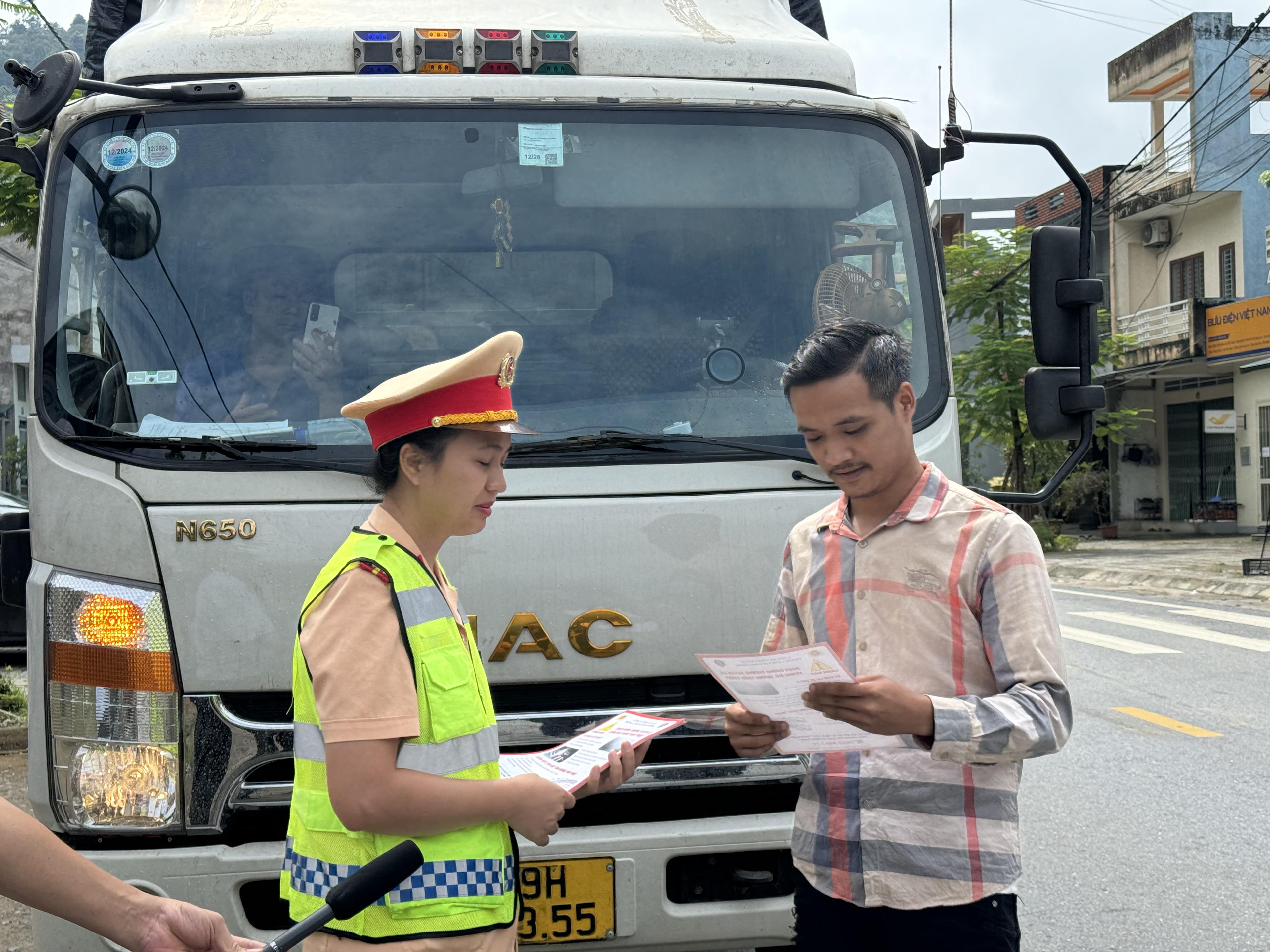 Lực lượng CSGT, Công an tỉnh Lào Cai tuyên truyền cho lái xe về các cung đường nguy hiểm trên đường tham gia giao thông. |