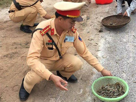 CSGT 'đội nắng' dọn đá dăm, nhặt cá giúp người dân