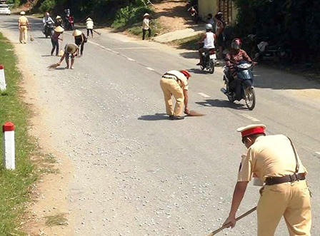 Chiều tối 26/6, hình ảnh CSGT cùng người dân quét đá dăm rơi vãi trên đường được chia sẻ chiếm cảm tình của nhiều cư dân mạng.