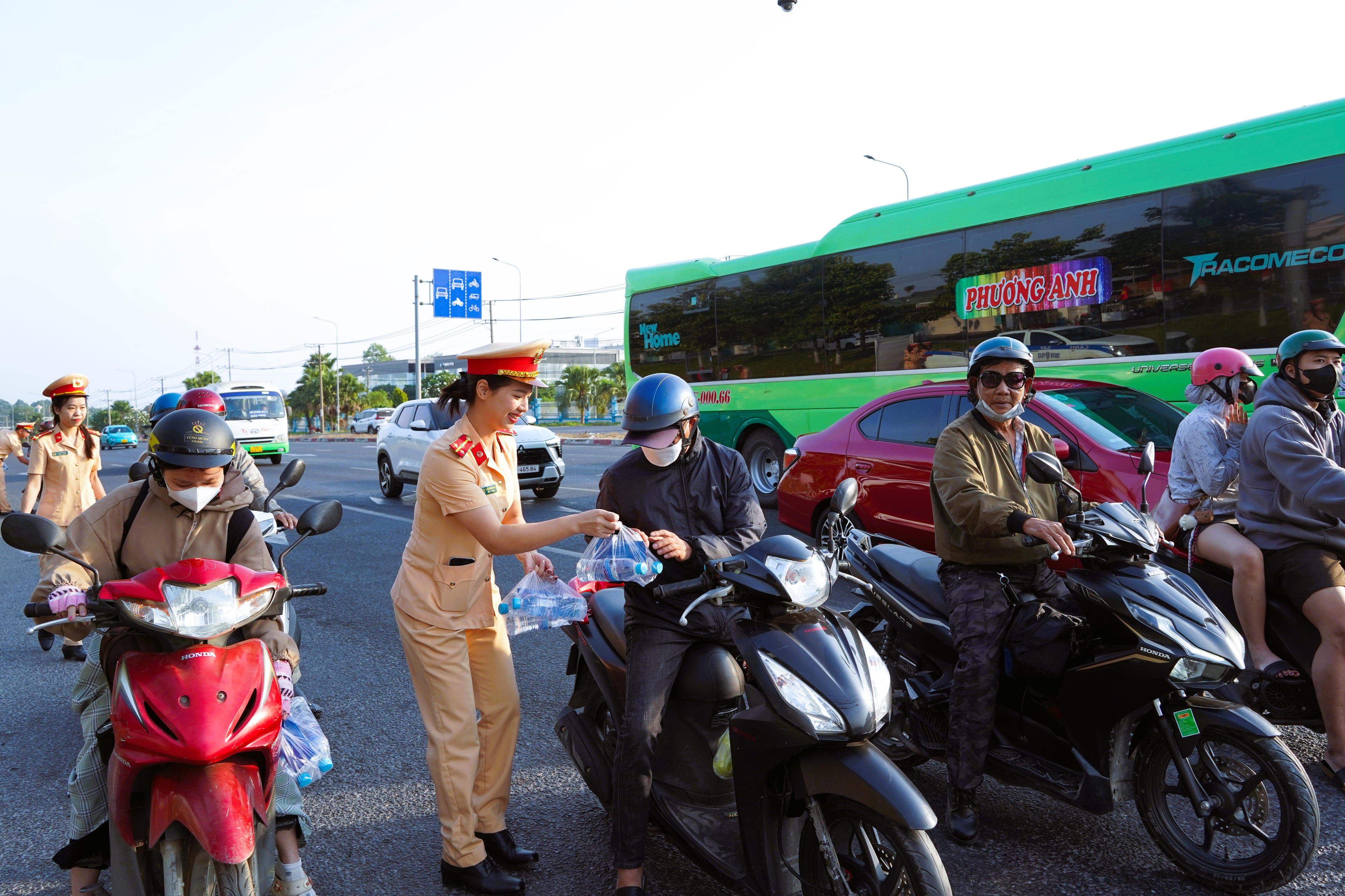 Trên các quốc lộ 20, quốc lộ 51, quốc lộ 1, lực lượng CSGT đã phát 60.000 chai nước và 60.000 khăn lạnh cho người tham gia giao thông. |