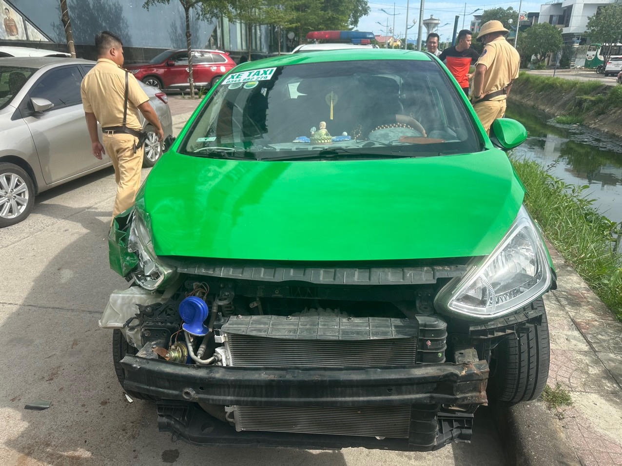 Do bị đâm mạnh, mất lái nên bánh bên lái taxi điên leo lên lề đường, hư hỏng nặng phần đầu mới chịu dừng lại và bị bắt giữ.