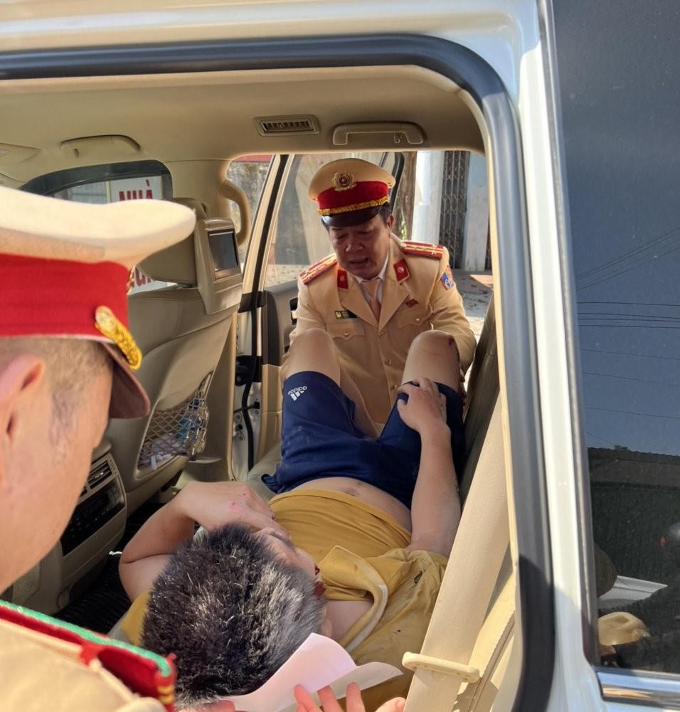 Đại tá Lê Văn Chiến - Trưởng phòng CSGT Công an tỉnh Thanh Hóa hỗ trợ đưa nạn nhân lên xe chuyên dụng đi cấp cứu. |