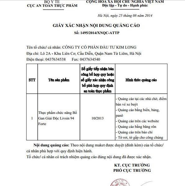 Theo đó, thực phẩm chức năng Bổ Gan Giải Độc Livsin 94 Forte có nội dung quảng cáo phải tuân thủ “Theo nội dung maket được duyệt (đính kèm) của tổ chức/cá nhân phù hợp với quy định hiện hành. Tổ chức/ cá nhân có trách nhiệm quảng cáo đúng nội dung đã được xác nhận” – Cục ATTP quy định rõ.