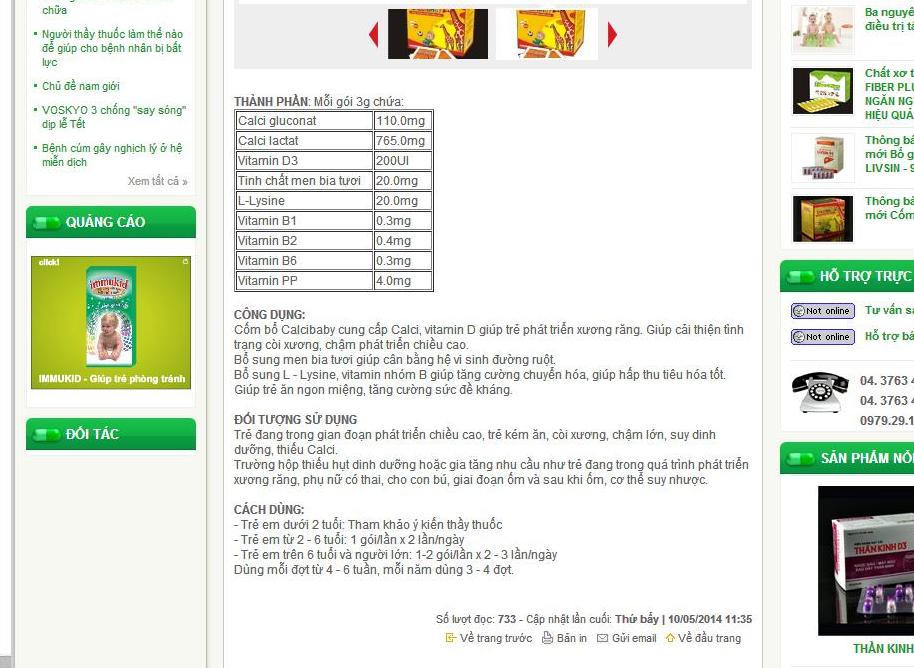 Trường hợp thứ 2 tương tự, đó là việc quảng cáo sản phẩm thực phẩm chức năng Cốm bổ Calcibaby. Sản phẩm này có giấy xác nhận công bố TCSP số 13156/2013/ATTP-XNCB. Mặc dù mô tả khá chi tiết về công dụng, đối tượng, cách dùng… nhưng doanh nghiệp hoàn toàn không đưa nội dung khuyến cáo “Sản phẩm này không phải là thuốc và không có tác dụng thay thế thuốc chữa bệnh” vào quảng cáo của mình.