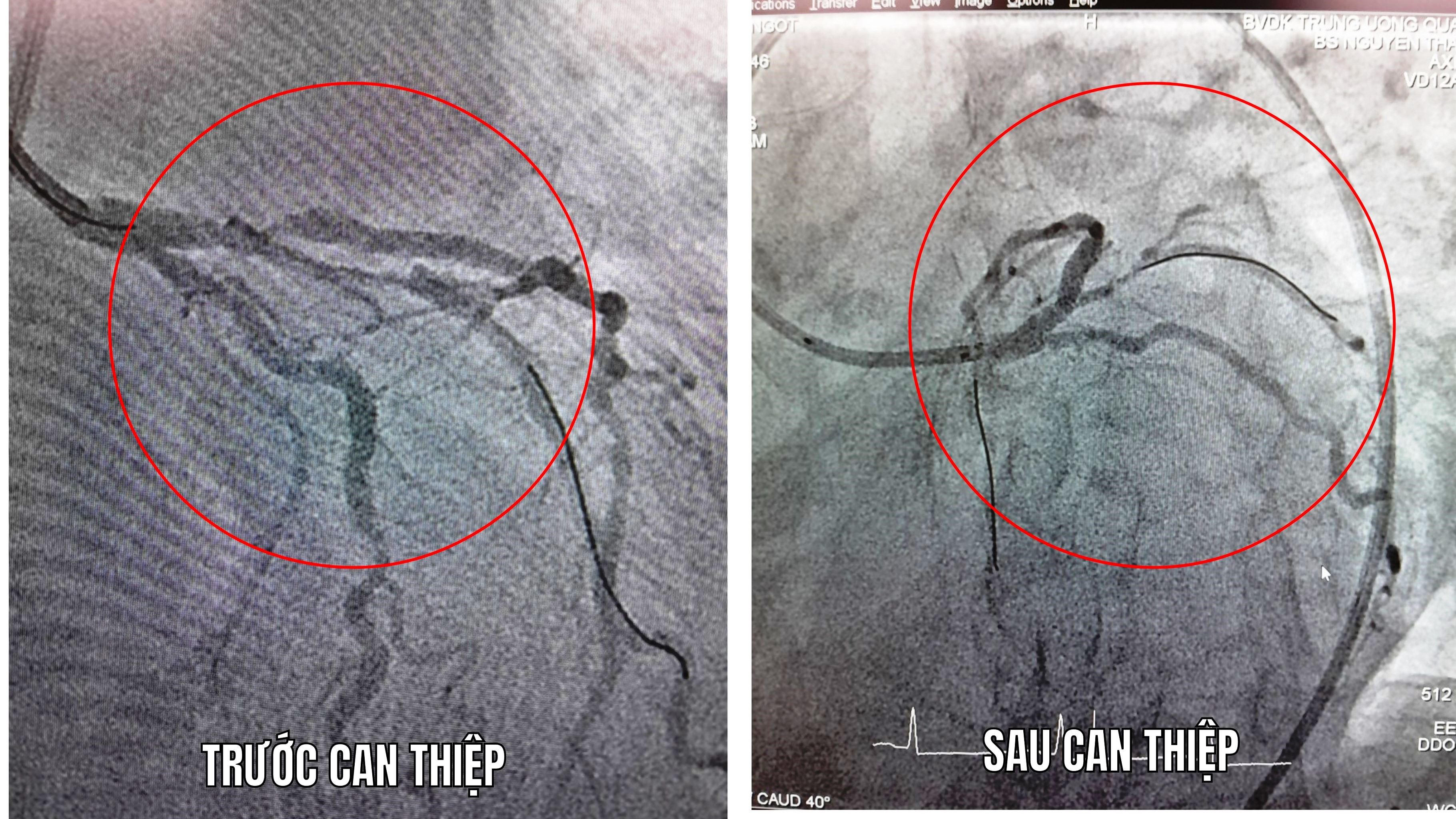 Tại phòng can thiệp, người bệnh lên cơn phù phổi cấp liên tục, được gây mê, đặt nội khí quản, thở máy và tiến hành chụp mạch vành cấp cứu cho kết quả là bán tắt lỗ vào động mạch liên thất trước (LAD) với dòng chảy qua rất chậm. Sau đó, người bệnh được can thiệp cấp cứu, trong lúc can thiệp người bệnh ngưng tim, tụt huyết áp liên tục. Vì vậy, các bác sĩ phải vừa hồi sức vừa can thiệp cùng lúc.