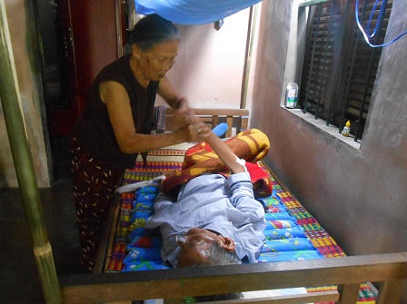 Cụ Rớt cho biết: “Từ khi bị tai nạn về, ông cụ nằm liệt giường đến bây giờ, không còn biết gì, gia đình cho ông ăn, uống gì cũng qua cái ống xông ở mũi, tay và chân phải của ông cụ không còn cảm giác cơ thể đã bị liệt gần nửa người, sinh hoạt vệ sinh cũng rất vất vả cho bà cụ”.