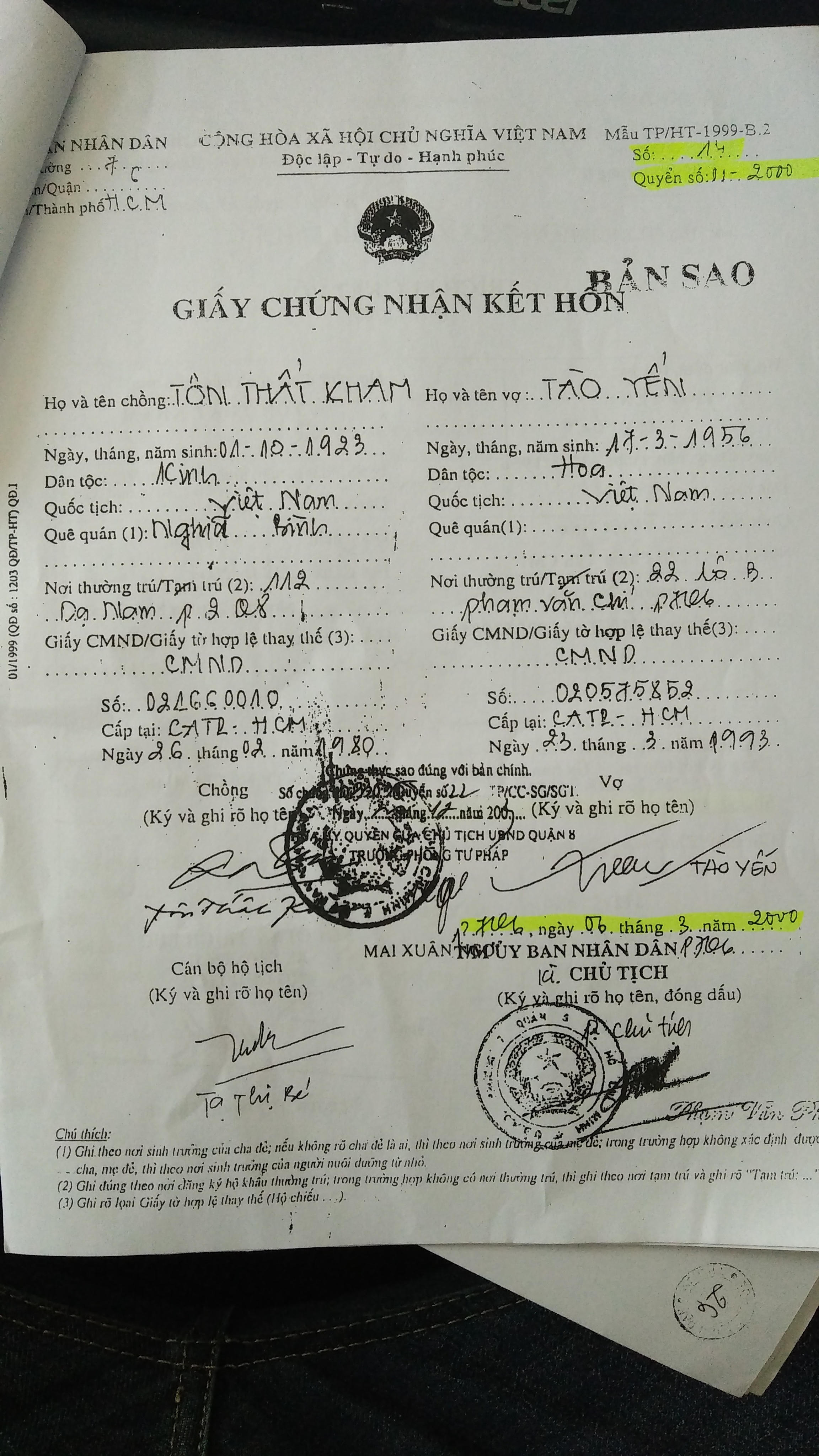 “Quan tài của cha tôi không được đặt ở căn nhà số 112 đường Dạ Nam. Hỏi mấy người con của bà Thành thì những người này nói rằng “bà Yến lừa cha chiếm căn nhà, giờ không còn làm gì được”. Anh em chúng tôi không hề hay biết chuyện gì kể cả việc bà Yến và cha tôi có đăng ký kết hôn vào năm 2000 tại phường 7, quận 6”.