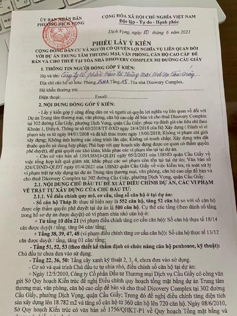 Anh Nguyễn Minh Nhật – người mua 2 căn hộ tại chung cư Discovery (302 Cầu Giấy - Hà Nội) phản ánh, mới đây anh và các cư dân bất ngờ nhận được Phiếu lấy ý kiến cộng đồng dân cư và người có quyền lợi nghĩa vụ liên quan với Trung tâm thương mại, văn phòng, căn hộ cao cấp để bán và cho thuê tại tòa nhà Discovery Complex 302 Cầu Giấy.
