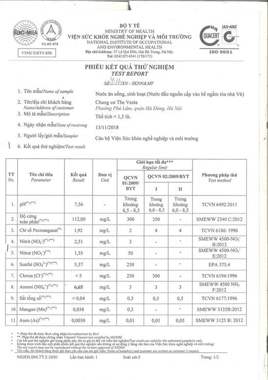 Tuy nhiên, kể từ khi những căn hộ đầu tiên được bàn giao hơn một năm nay, cư dân tại Chung cư The Vesta luôn ám ảnh vì nguồn nước sinh hoạt do Công ty TNHH MTV nước sạch Hà Đông cung cấp chứa amoni vượt giới hạn cho phép. Đây cũng chính là băn khoăn, lo ngại của nhiều khách hàng đang có ý định mua nhà tại dự án này.