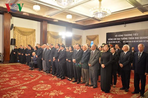 Trước linh cữu của đồng chí Trần Đại Quang, bên trên là Quốc kỳ viền dải băng đen, nổi bật dòng chữ “Vô cùng thương tiếc đồng chí Đại tướng Trần Đại Quang, Ủy viên Bộ Chính trị, Chủ tịch nước Cộng hòa xã hội chủ nghĩa Việt Nam” và di ảnh của đồng chí.