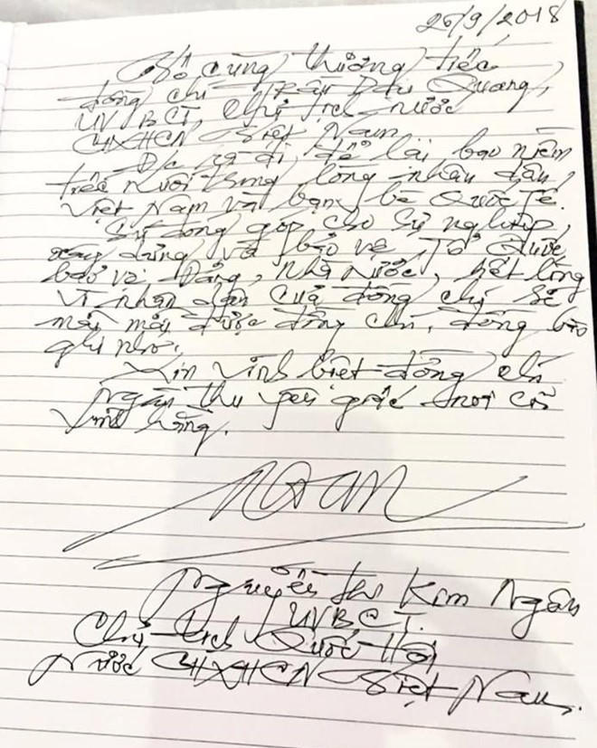 Xúc động ghi sổ tang, Chủ tịch Quốc hội Nguyễn Thị Kim Ngân bày tỏ: “Vô cùng thương tiếc Đồng chí Trần Đại Quang, Ủy viên Bộ Chính trị, Chủ tịch nước Cộng hòa xã hội chủ nghĩa Việt Nam.