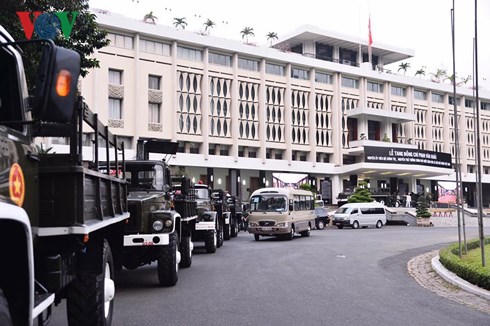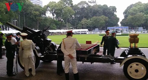 Cỗ linh xa đã được di chuyển đến trước Hội trường Thống Nhất, các đoàn xe quân đội sẵn sàng thực hiện nghi thức Lễ tang cấp Quốc gia nguyên Thủ tướng Phan Văn Khải.