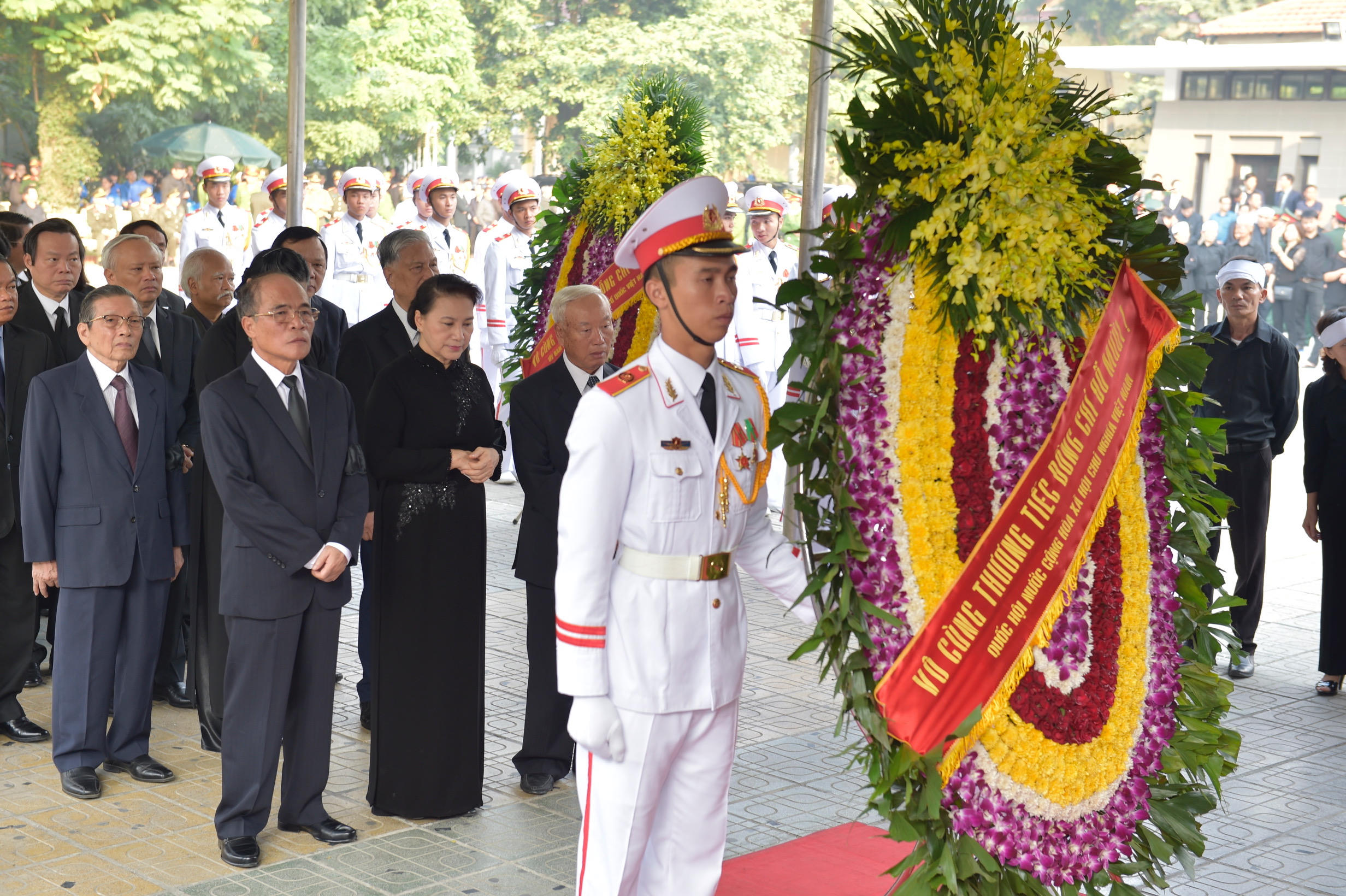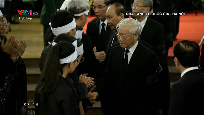 Trước 7h, tại nhà tang lễ quốc gia, Tổng bí thư Nguyễn Phú Trọng, Thủ tướng Nguyễn Xuân Phúc, Chủ tịch Quốc hội Nguyễn Thị Kim Ngân cùng nhiều vị lãnh đạo, nguyên lãnh đạo Đảng, Nhà nước đã có mặt ở Nhà tang lễ để chuẩn bị bắt đầu lễ viếng chính thức.
