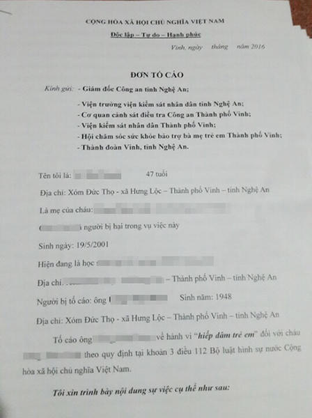 Ngày 21/3, bà Nguyễn Thị Thương (SN 1969, trú tại xã Hưng Lộc, TP.Vinh, Nghệ An) cho biết, con gái bà là U.T.L (SN 2001) vừa sinh em bé, gia đình đã làm đơn gửi đến Công an TP.Vinh tố cáo ông U.N.Đ. có hành vi hiếp dâm con gái bà.