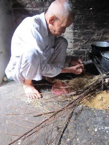 Khi chúng tôi đến, cụ Mạo đang loay hoay trong gian bếp lụp xụp, nhóm lửa thổi cơm trưa cho cả gia đình. Một tay cầm nồi, một tay chống gậy, cụ dò dẫm từng bước ra bể lấy nước, rửa rau rồi lại lật đật trở vào. Giữa trưa nắng gắt, chiếc bóng nhỏ bé của cụ in trên nền sân rêu mốc, nơi đã bao nhiêu năm chứng kiến cảnh cụ dãi nắng dầm mưa, đấu tranh với đói nghèo.