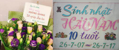Ông ngoại tự tay viết những dòng chữ trên bó hoa tặng cháu gái, trang trí sinh nhật cho cháu trai. |